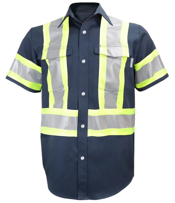 - Bandes réfléchissantes collées à chaud 2¨ argent sur tissu jaune fluorescent 4¨ de largeur (à la taille, poitrine, bras & “X” au dos)